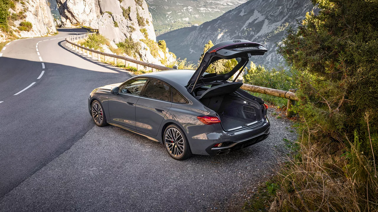 When compared to the preceding A4, the all-new A5 is 2.6" longer, 0.5" wider, and 1.6" taller, increasing interior space and comfort for driver and passengers. The all-new A5 also utilizes an integrated rear deck that opens and closes with the rear window, giving greater ease of access for loading and unloading the trunk. Storage capacity is 640L with the rear seats raised, and 1,036L with the rear seats lowered.